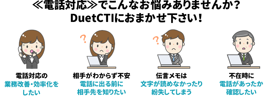 DuetCTIは、着信時に発信元の情報が表示されるCTIシステムです。 その他にも、既読機能付き伝言メッセージ機能や、電話・FAXの発着信履歴などの電話対応をサポートする機能をご提供致します。